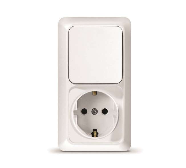 Блок объединяет одноклавишный выключатель и розетку.