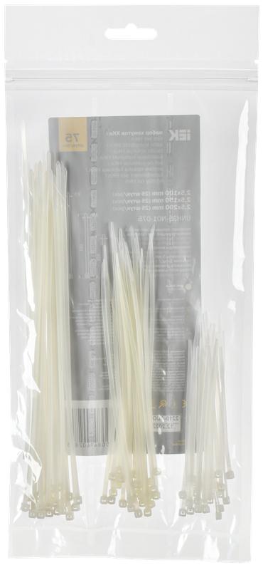 Набор включает в себя по 25 белых кабельных хомутов каждого размера - 2,5х100; 2,5х150; 2,5х200.