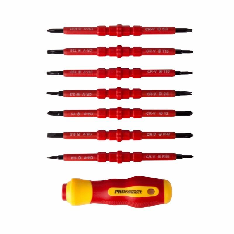 Двухсторонние стержни отвертки из высококачественной хромованадиевой стали с оксидированным намагниченным наконечником, покрыты специальным изоляционным материалом.
